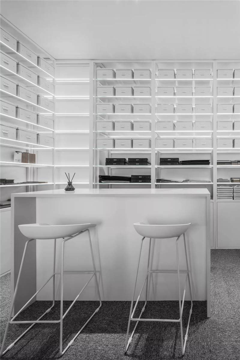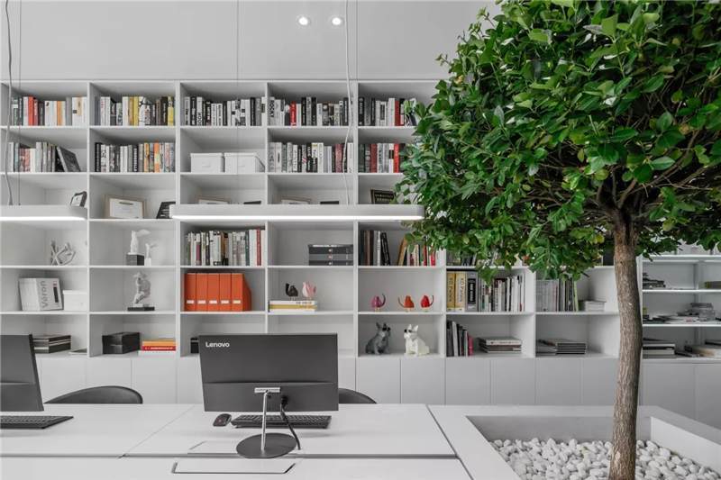 在這里,未知的一切與既有的常識記憶產(chǎn)生傳導,想象思維的觸角開始蔓延。小株綠樹分隔出挑高的白色高座式二人桌,提供了一種更為隨性、更利于面對面交流的辦公形式。