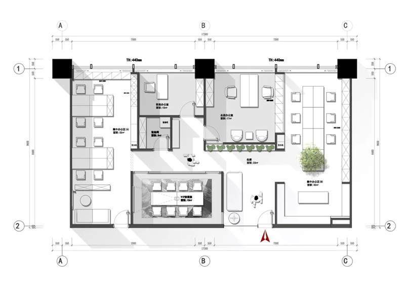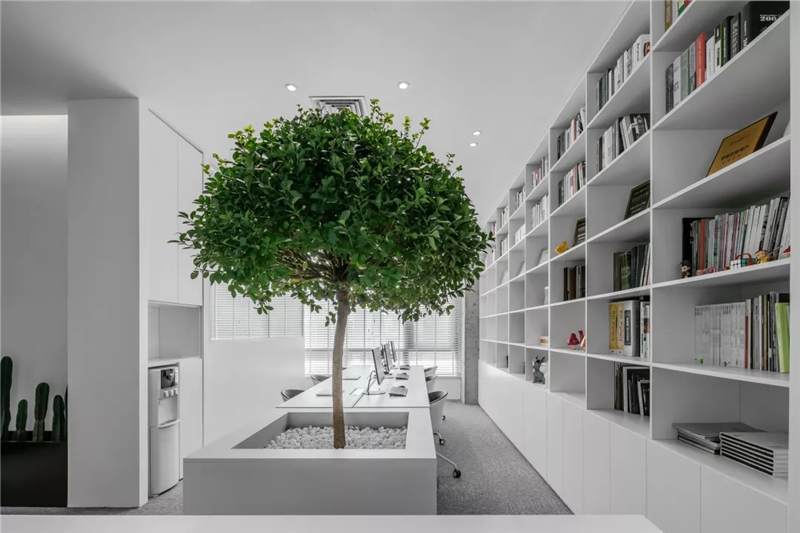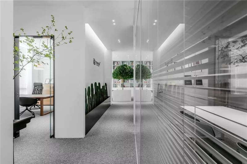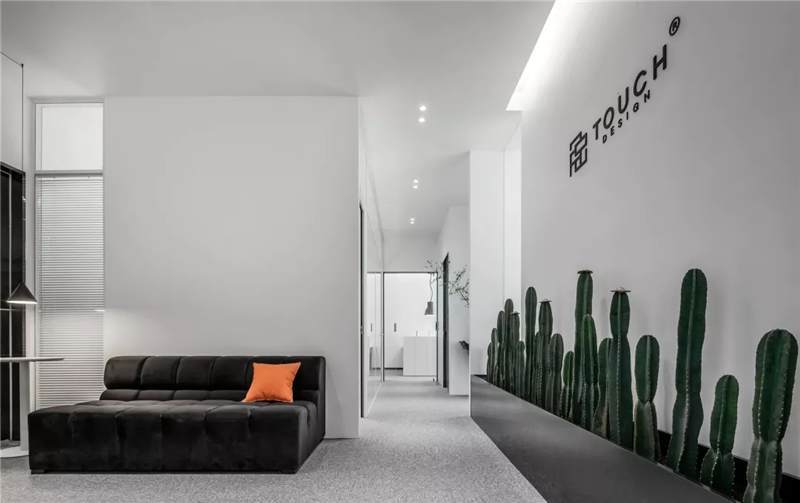 刪繁就簡,以最經(jīng)典的白色為主題搭配色調(diào),沒有繁瑣的設計和過多的裝飾,減去辦公中的壓抑感。通過將自然純凈的白色與沉靜黑色相結(jié)合,將品牌形象簡潔地呈現(xiàn)表達,同時為左右空間的過渡創(chuàng)建和諧觀感。純白的墻面,接近心靈的澄凈;仙人掌是視覺的焦點,恣意生長、堅韌、夯實根基,也正寓意著公司的設計理念:有所依、有所仗、有所長。