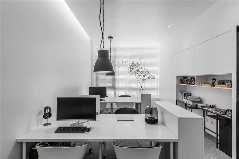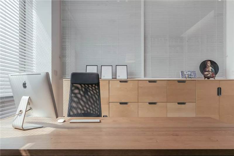 自由無拘的溝通對于團隊的創(chuàng)新至關(guān)重要。開放的辦公區(qū)是有效獲取信息和激發(fā)靈感的地方。百葉窗折射的光影,充足的自然光營造高效的工作環(huán)境??臻g雖然有限,但發(fā)揮最大的性能,開辟出一整面的軟裝材料搭配區(qū)。