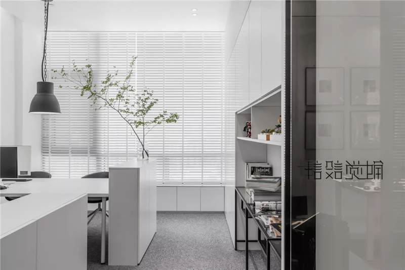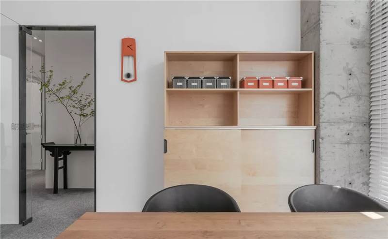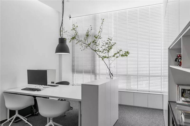 另一側(cè)的空間則增添了二三分私密性。沉穩(wěn)的木質(zhì)案桌上,擺放的綠枝椏仿若思想的觸手,與仙人掌、小株綠植串聯(lián)起空間動線。區(qū)域內(nèi)各自獨立,用玻璃門分隔開,在保證個人能最大限度沉浸思維創(chuàng)作的同時,又能及時地與伙伴交流互換,碰撞不同的思想。