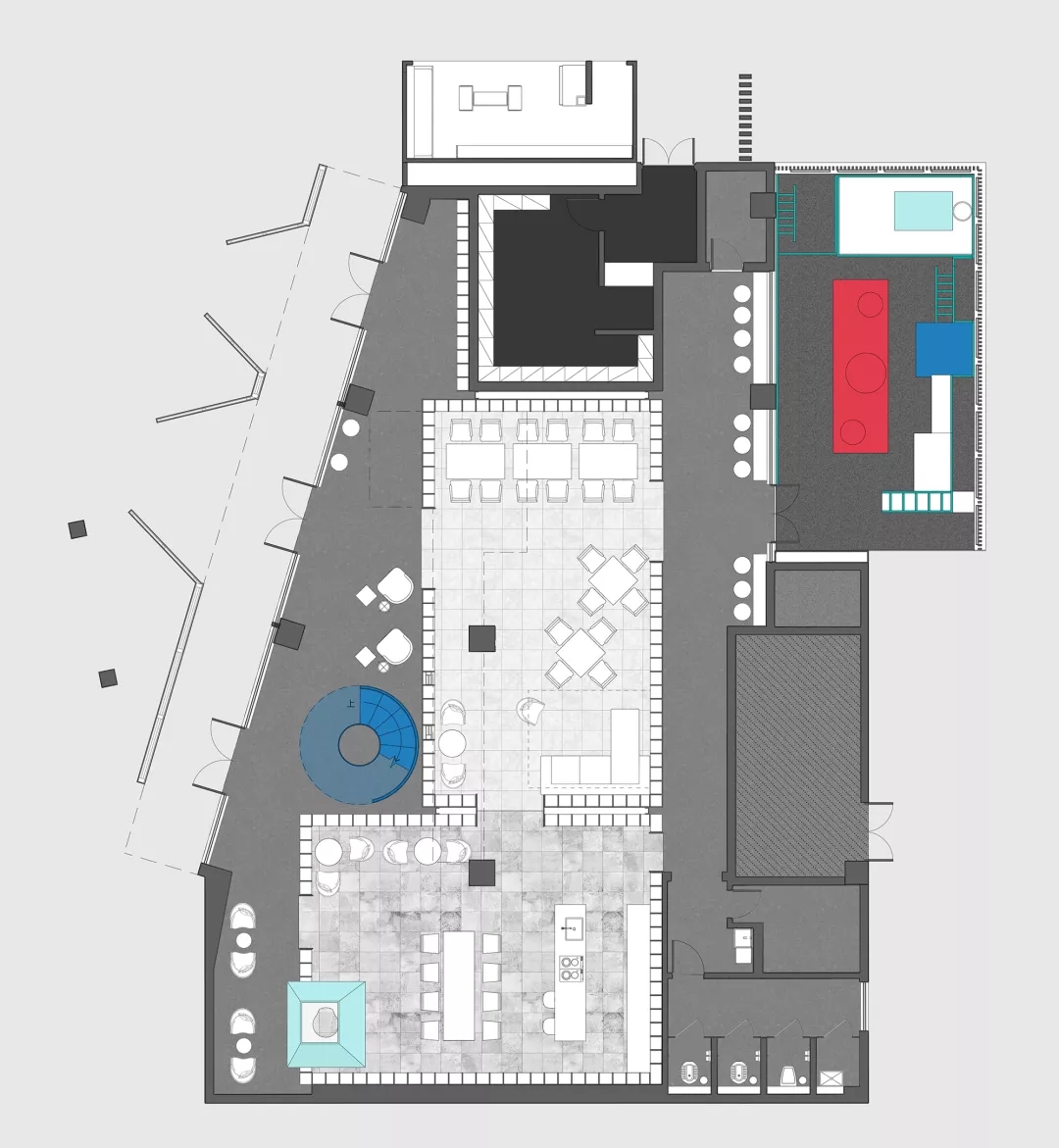 我們?cè)O(shè)計(jì)了一個(gè)夾層走廊隱藏在書(shū)架上.在課題研究中如何利用層高一直是房產(chǎn)商關(guān)心的,以我的實(shí)際經(jīng)驗(yàn),凈高2.1米仍然具有一定舒適度。在本案中,原本懸在社交盒子上的麻將房因?yàn)橐粯菍痈哌^(guò)低無(wú)法成立,于是我們直接切斷,形成一個(gè)小陽(yáng)臺(tái)作為暗示。