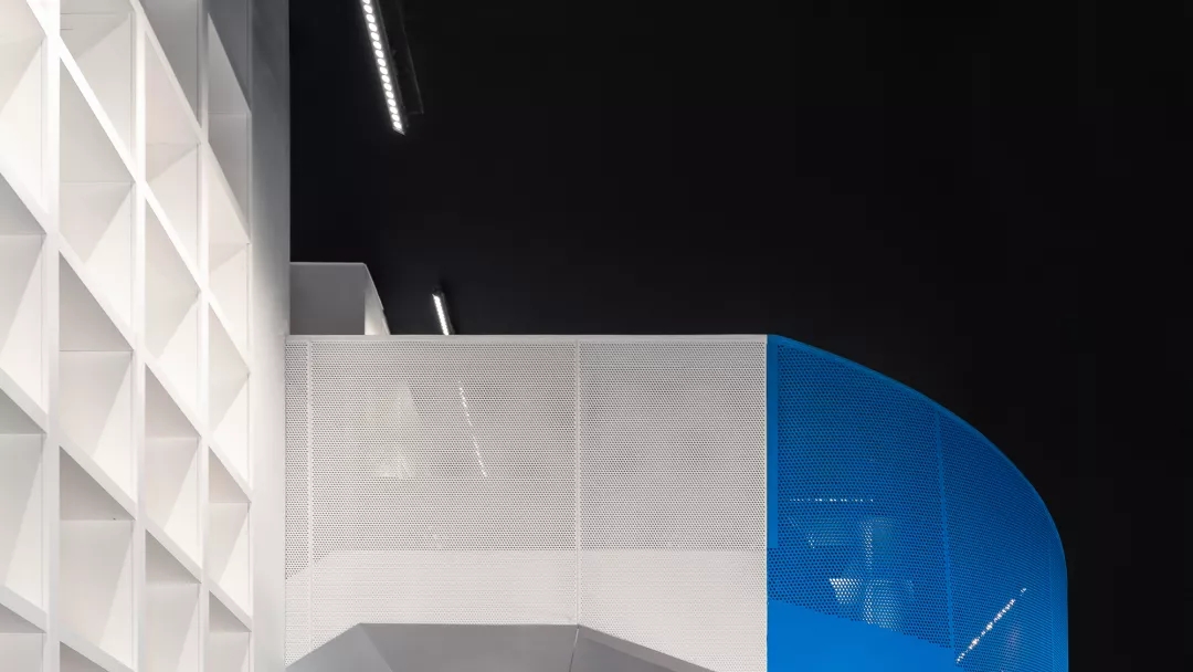 我用蒂芬妮藍(lán)閱讀屋作為女性盒子的中心,與此呼應(yīng)的是入口可見(jiàn)的卡萊茵藍(lán)螺旋樓梯,以及盒子背面室外的明黃色兒童活動(dòng)場(chǎng)地。他們精致地鑲嵌在有些迷離模糊的空間中成為點(diǎn)睛之筆。如果社區(qū)客廳藏在陳詞濫調(diào)的商業(yè)里面之后,就失去了示范作用。有空客廳的立面就是一個(gè)打開(kāi)的盒子,高4米的半開(kāi)門(mén)是穿孔鋁板制作的,形成了Wutopia Lab標(biāo)志性的半透明界面。你能從這里隱隱約約的窺看到,溫暖的燈光,明亮的藍(lán)色,和孩子的笑聲。