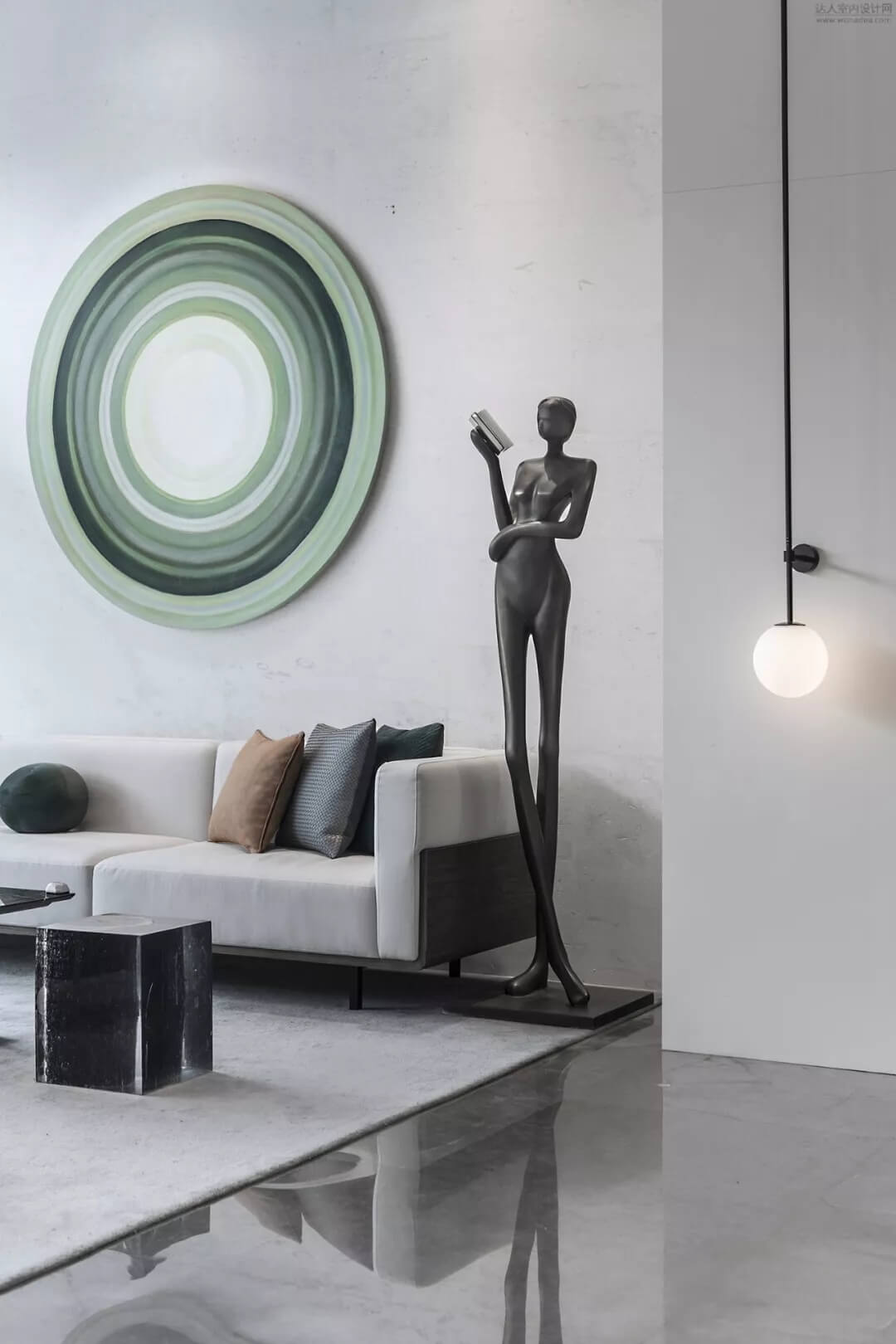 尊重木質(zhì)的肌理美感,熟諳工藝,亞克力材質(zhì)包裹的木質(zhì)年輪,如同凍結(jié)了時間的流逝,守住這一刻的永恒。簡潔的質(zhì)感綠色皮質(zhì)沙發(fā)予以低調(diào)的奢華,同色系的植被增加了空間層次感。