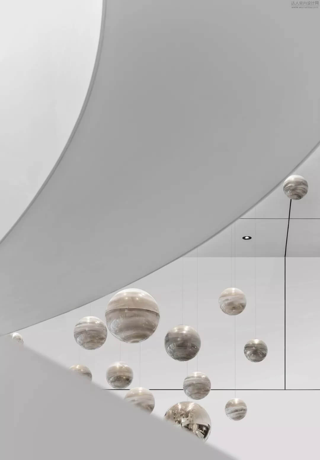 淡雅的白色配以溫馨木色的夢幻般旋轉(zhuǎn)樓梯入口,白色球體與之呼應,旋轉(zhuǎn)而上,動態(tài)感的景色盡收眼底,格子狀猶如延續(xù)的·星際穿越,感受平衡時空不同維度的交措時光,身處'空間',在無限與有限中穿梭,不經(jīng)意的轉(zhuǎn)角余光是同色的球燈相映,優(yōu)秀的設計師是會講故事的人。