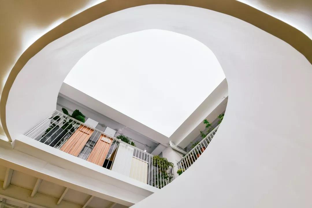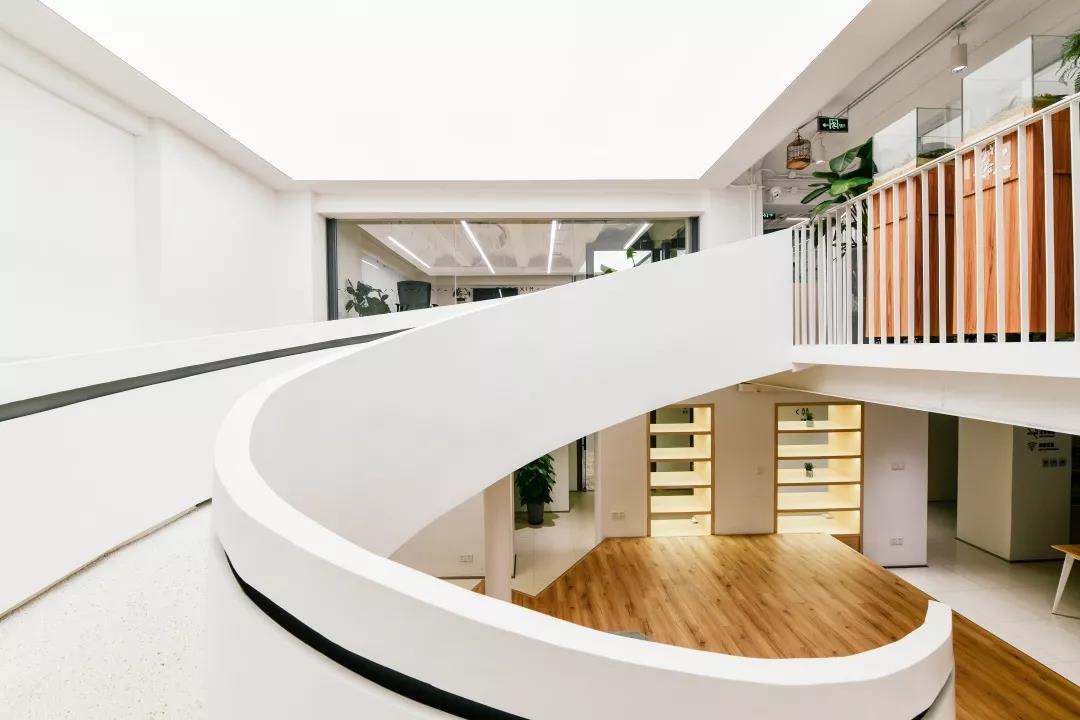 整個(gè)空間最大的視覺(jué)中心便是中庭里那個(gè)“刻意”彰顯存在感的樓梯,優(yōu)美的弧線激發(fā)并引導(dǎo)著大家探索上層空間的欲望。在最初的方案中,它其實(shí)并不是曲線,而是剛毅的直線,我們認(rèn)為直線的迷人在于它的簡(jiǎn)單、坦誠(chéng),棱角分明且封閉的做法讓它如雕塑一般矗立。