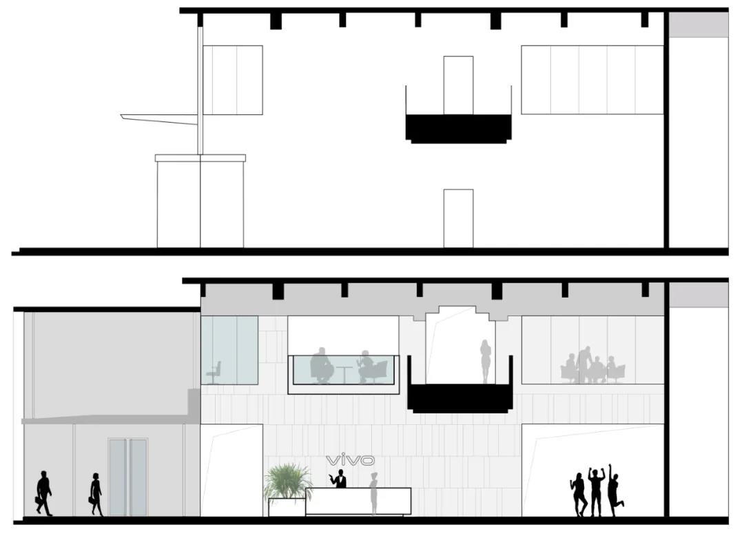 大堂作為整體的對外開放和形象展示空間,配備了咖啡,休閑茶水,展廳,洽談,會議等開放的功能性空間,配以圖像視覺傳達設(shè)計,軟植入vivo品牌精神。