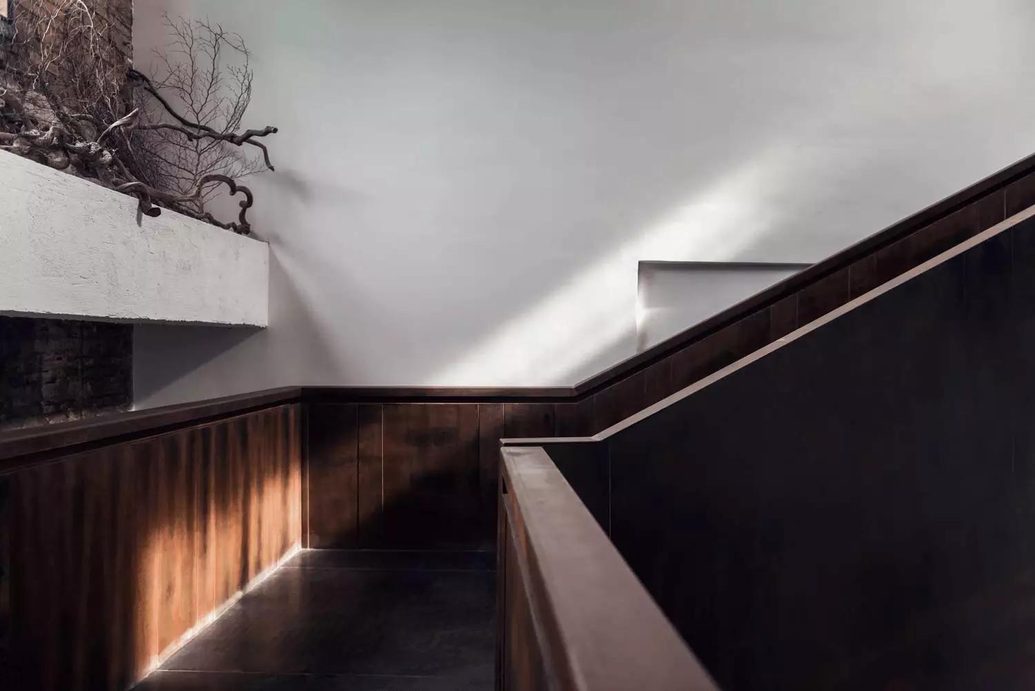 直線組合而成的吊燈利落的拉伸在樓梯中部,與不斷變化、充滿戲劇色彩的自然光互相補(bǔ)充,吊燈的照明使空間更平衡與緩和,穩(wěn)定了光影變化中的視覺感受。