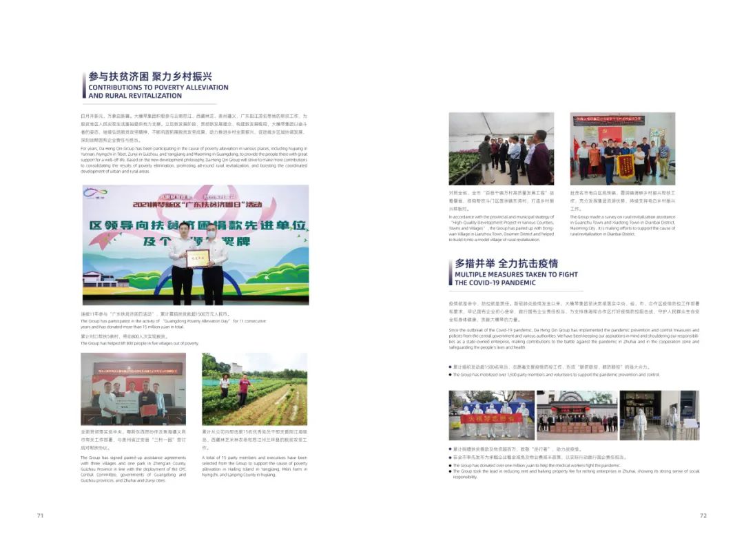 積極參與云南怒江、西藏林芝、貴州遵義、廣東陽江茂名等地的幫扶工作,助力推進(jìn)鄉(xiāng)村全面振興;在疫情防控的特殊時(shí)期,舉全集團(tuán)之力支持珠海和合作區(qū)打好疫情防控阻擊戰(zhàn);主動(dòng)投身社會(huì)民生事業(yè),開展公益活動(dòng),為珠海建設(shè)民生幸福樣板城市貢獻(xiàn)力量……