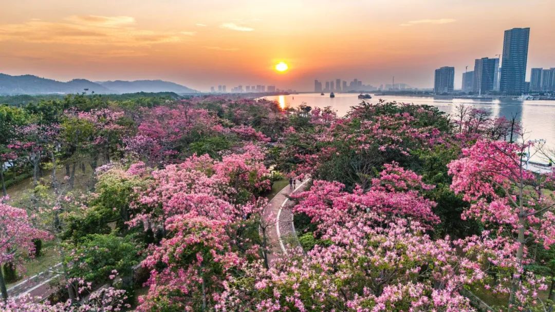 每年立冬前后,告別春夏雨季的橫琴花海長(zhǎng)廊便迎來(lái)了她一年之中最美麗的季節(jié)——美麗異木棉盛花期。絢爛的粉色花海以飽滿、茂盛、茁壯的姿態(tài)展現(xiàn)在市民游客們面前,海岸四處洋溢著浪漫與溫馨。